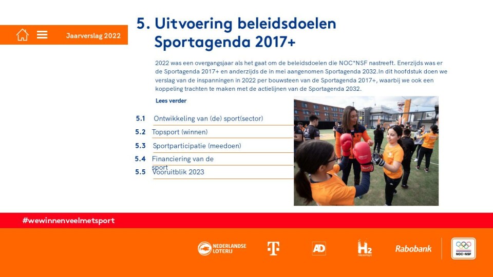 2022 was een overgangsjaar als het gaat om de beleidsdoelen die NOC*NSF nastreeft. Enerzijds was er de Sportagenda 2017+ en anderzijds de in mei aangenomen Sportagenda 2032.In dit hoofdstuk doen we verslag van de inspanningen in 2022 per bouwsteen van de Sportagenda 2017+, waarbij we ook een koppeling trachten te maken met de actielijnen van de Sportagenda 2032.