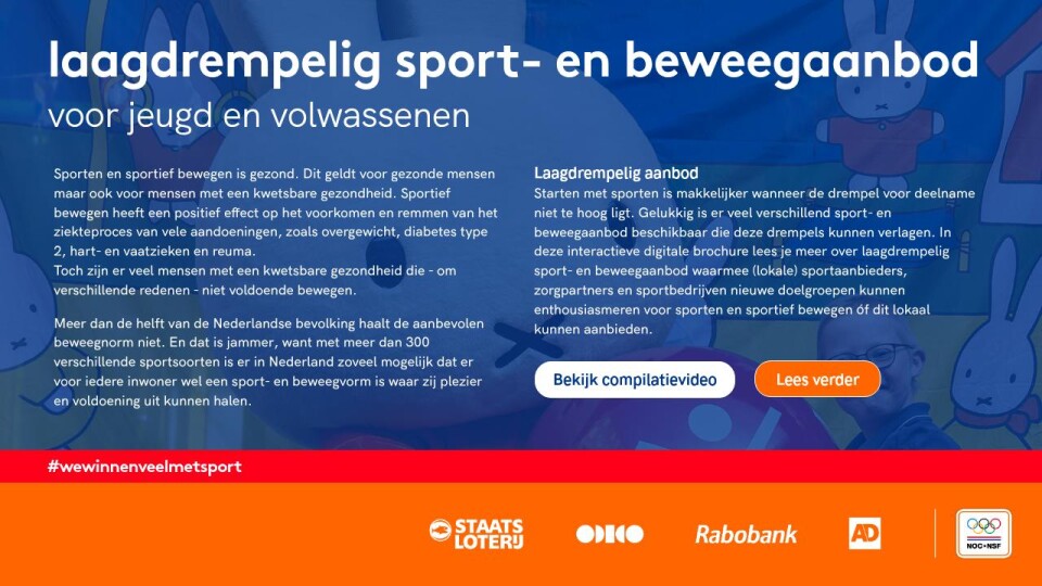 Starten met sporten is makkelijker wanneer de drempel voor deelname niet te hoog ligt. Gelukkig is er veel verschillend sport- en beweegaanbod beschikbaar die deze drempels kunnen verlagen. In deze interactieve digitale brochure lees je meer over laagdrempelig sport- en beweegaanbod waarmee (lokale) sportaanbieders, zorgpartners en sportbedrijven nieuwe doelgroepen kunnen enthousiasmeren voor sporten en sportief bewegen óf dit lokaal kunnen aanbieden.