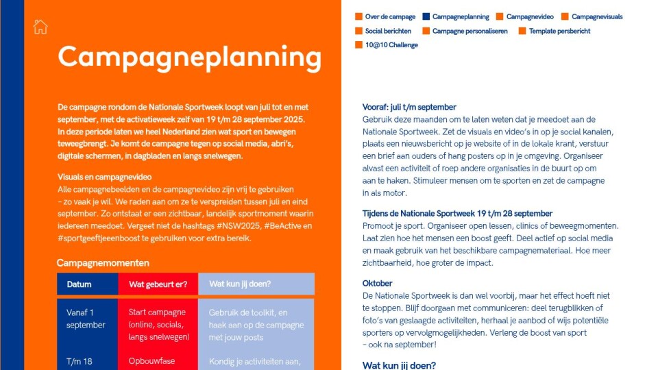 – zo vaak je wil. We raden aan om ze te verspreiden tussen juli en eind september. Zo ontstaat er een zichtbaar, landelijk sportmoment waarin iedereen meedoet. Vergeet niet de hashtags #NSW2025, #BeActive en #sportgeeftjeeenboost te gebruiken voor extra bereik.